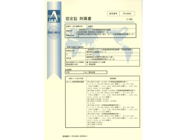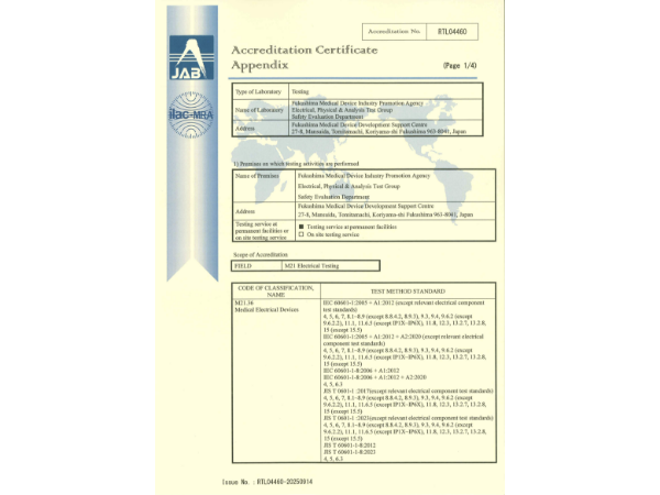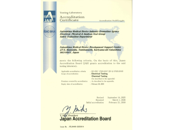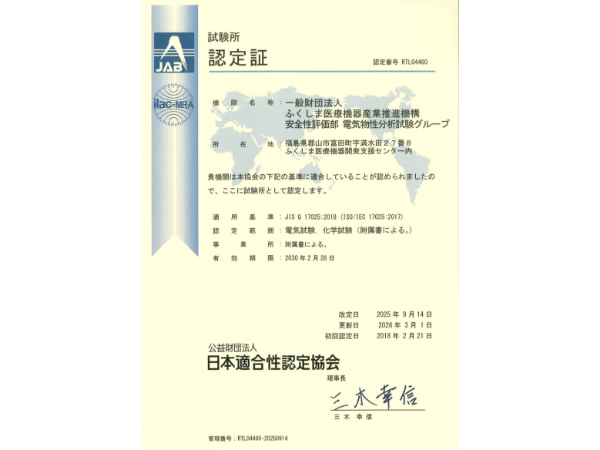 ふくしま医療機器開発支援センターの指定管理者である一般財団法人ふくしま医療機器産業推進機構は、ISO/IEC 17025:2017規格要求事項に基づく試験所として、公益財団法人日本適合性認定協会(JAB)より認定されています。